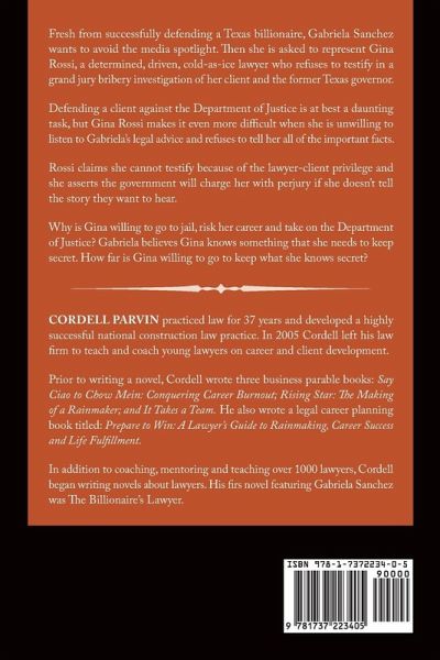 Fresh from successfully defending a Texas billionaire, Gabriela Sanchez wants to avoid the media spotlight. Then she is asked to represent Gina Rossi, a determined, driven, cold-as-ice lawyer who refuses to testify in a grand jury bribery investigation of her client and the former Texas governor. Defending a client against the Department of Justice is at best a daunting task, but Gina Rossi makes it even more difficult when she is unwilling to listen to Gabriela's legal advice and refuses to tell her all of the important facts. Rossi claims she cannot testify because of the lawyer-client privilege and she asserts the government will charge her with perjury if she doesn't tell the story they want to hear. Why is Gina willing to go to jail, risk her career and take on the Department of Justice? Gabriela believes Gina knows something that she needs to keep secret. How far is Gina willing to go to keep what she knows secret?