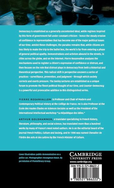 Democracy is established as a generally uncontested ideal, while regimes inspired by this form of government fall under constant criticism. Hence, the steady erosion of confidence in representatives that has become one of the major political issues of our time. Amidst these challenges, the paradox remains that while citizens are less likely to make the trip to the ballot box, the world is far from entering a phase of general political apathy. Demonstrations and activism abound in the streets, in cities across the globe and on the internet. Pierre Rosanvallon analyses the mechanisms used to register a citizen's expression of confidence or distrust, and then focuses on the role that distrust plays in democracy from both a historical and theoretical perspective. This radical shift in perspective uncovers a series of practices - surveillance, prevention, and judgement - through which society corrects and exerts pressure.