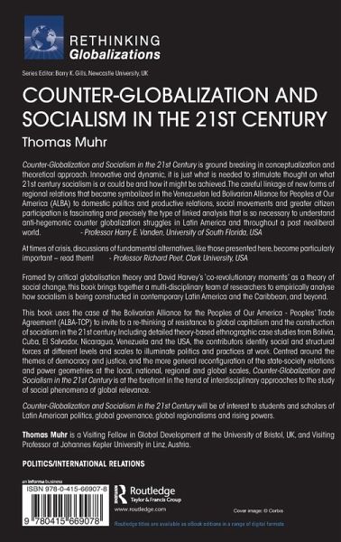 Framed by critical globalisation theory and David Harvey's 'co-revolutionary moments' as a theory of social change, this book brings together a multi-disciplinary team of researchers to empirically analyse how socialism is being constructed in contemporary Latin America and the Caribbean, and beyond. This book uses the case of the Bolivarian Alliance for the Peoples of Our America - Peoples' Trade Agreement (ALBA-TCP) to invite to a re-thinking of resistance to global capitalism and the construction of socialism in the 21st century. Including detailed theory-based ethnographic case studies from Bolivia, Cuba, El Salvador, Nicaragua, Venezuela and the USA, the contributors identify social and structural forces at different levels and scales to illuminate politics and practices at work. Centred around the themes of democracy and justice, and the more general reconfiguration of the state-society relations and power geometries at the local, national, regional and global scales, ALBA and Counter-Globalization is at the forefront in the trend of interdisciplinary approaches to the study of social phenomena of global relevance. Counter-Globalization and Socialism in the 21st Century will be of interest to students and scholars of Latin American politics, global governance, global regionalisms and rising powers.