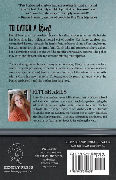 USA TODAY BESTSELLING AUTHOR "This fast-paced, action-filled whodunit was enjoyable and hard to put down. The mystery was good, the characters are likeable and it was fun to watch all the pieces come together in this well-written drama. I'm looking forward to the next book in this series." - Dru's Book Musings "Funny, fast paced and just a smidge of romance. What more could you ask for? Bring on the next one!" - T. Sue Versteeg, Author of My Ex-Boyfriend's Wedding "A high-octane, fast-paced thrill ride of a mystery adventure that will definitely leave you anxious for the next installment." - Girl with Book Lungs "This fast-paced mystery had me reading far past my usual time for bed. I simply couldn't put it down because I was so drawn into the story. It's simply wonderful!" - Dianne Harman, Author of the Cedar Bay Cozy Mysteries "The book takes you on car chases, shooting, great locations around the world all in the hopes of finding a missing friend and lost artifact. I read the book three times enjoying each time." - Heidi Wimmer, Book Him Danno "An intricately woven tale with plenty of action and suspense. The story is crafted in such a way to keep readers guessing. The characters are well-written with smart and witty dialogue. An enjoyable read." - A Cozy Book Nook "A fast-paced book, and to save the day, Laurel takes you with her every step of the way on subways, planes, fast cars, and motorcycles all while being in danger. This book is truly a keeper, jump in a go for a ride!" - Destiny's Book Reviews "I love the main character of Laurel. She is not just smart - she is quick on the uptake and manages to get herself out of many tight spots...a fast-paced, well-plotted read. I could not put this book down. I hope we get to read many more adventures with Laurel in the future. So if you like a mystery with a touch of James Bond, you should be reading Counterfeit Conspiracies." - Cheryl Green, MyShelf Reviews Laurel Beacham may have been born with a silver spoon in her mouth, but she has long since lost it digging herself out of trouble. Her father gambled and womanized his way through the family fortune before skiing off an Alp, leaving her with more tarnish than trust fund. Quick wits and connections have gained her a reputation as one of the world's premier art recovery experts. The police may catch the thief, but she reclaims the missing masterpieces. The latest assignment, however, may be her undoing. Using every ounce of luck and larceny she possesses, Laurel must locate a priceless art icon and rescue a co-worker (and ex-lover) from a master criminal, all the while matching wits with a charming new nemesis. Unfortunately, he seems to know where the bodies are buried-and she prefers hers isn't next. Related subjects include: women sleuths, cozy mysteries, amateur sleuth books, murder mysteries, whodunit mysteries (whodunnit), book club recommendations. Books in the Bodies of Art Mystery Series: ¿ COUNTERFEIT CONSPIRACIES (#1) ¿ MARKED MASTERS (#2) ¿ ABSTRACT ALIASES (#3) October 2016 Part of the Henery Press Mystery Series Collection, if you like one, you'll probably like them all... Author Bio: Ritter Ames lives atop a high green hill in the country with her husband and Labrador retriever, and spends each day globe-trotting the art world from her laptop with Pandora blasting into her earbuds. Often with the dog snoring at her feet. Much like her Bodies of Art Mysteries, Ritter's favorite vacations start in London, then spiral out in every direction. She's been known to plan trips after resear
