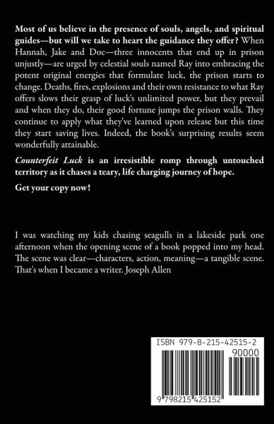 Most of us believe in the presence of souls, angels, and spiritual guides-but will we take to heart the guidance they offer? When Hannah, Jake and Doc-three innocents that end up in prison unjustly-are urged by celestial souls named Ray into embracing the potent original energies that formulate luck, the prison starts to change. Deaths, fires, explosions and their own resistance to what Ray offers slows their grasp of luck's unlimited power, but they prevail and when they do, their good fortune jumps the prison walls. They continue to apply what they've learned upon release but this time they start saving lives. Indeed, the book's surprising results seem wonderfully attainable. Counterfeit Luck is an irresistible romp through untouched territory as it chases a teary, life charging journey of hope. Get your copy now!