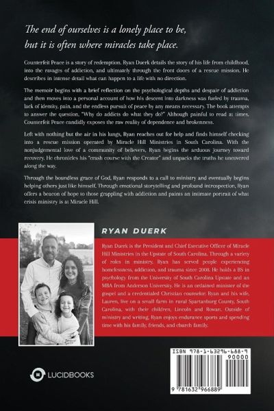 The end of ourselves is a lonely place to be, but it is often where miracles take place. Counterfeit Peace is a story of redemption. Ryan Duerk details the story of his life from childhood, into the ravages of addiction, and ultimately through the front doors of a rescue mission. He describes in intense detail what can happen to a life with no direction. The memoir begins with a brief reflection on the psychological depths and despair of addiction and then moves into a personal account of how his descent into darkness was fueled by trauma, lack of identity, pain, and the endless pursuit of peace by any means necessary. The book attempts to answer the question, "Why do addicts do what they do?" Although painful to read at times, Counterfeit Peace candidly exposes the raw reality of dependence and brokenness. Left with nothing but the air in his lungs, Ryan reaches out for help and finds himself checking into a rescue mission operated by Miracle Hill Ministries in South Carolina. With the nonjudgemental love of a community of believers, Ryan begins the arduous journey toward recovery. He chronicles his "crash course with the Creator" and unpacks the truths he uncovered along the way. Through the boundless grace of God, Ryan responds to a call to ministry and eventually begins helping others just like himself. Through emotional storytelling and profound introspection, Ryan offers a beacon of hope to those grappling with addiction and paints an intimate portrait of what crisis ministry is at Miracle Hill.