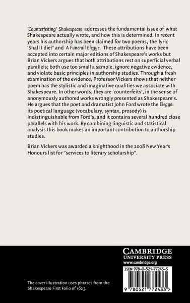 'Counterfeiting' Shakespeare addresses the fundamental issue of what Shakespeare actually wrote, and how this is determined. In recent years his authorship has been claimed for two poems, the lyric 'Shall I die?' and A Funerall Elegye. These attributions have been accepted into certain major editions of Shakespeare's works but Brian Vickers argues that both attributions rest on superficial verbal parallels; both use too small a sample, ignore negative evidence, and violate basic principles in authorship studies. Through a fresh examination of the evidence, Professor Vickers shows that neither poem has the stylistic and imaginative qualities we associate with Shakespeare. In other words, they are 'counterfeits', in the sense of anonymously authored works wrongly presented as Shakespeare's. He argues that the poet and dramatist John Ford wrote the Elegye: its poetical language (vocabulary, syntax, prosody) is indistinguishable from Ford's, and it contains several hundred close parallels with his work. By combining linguistic and statistical analysis this book makes an important contribution to authorship studies.