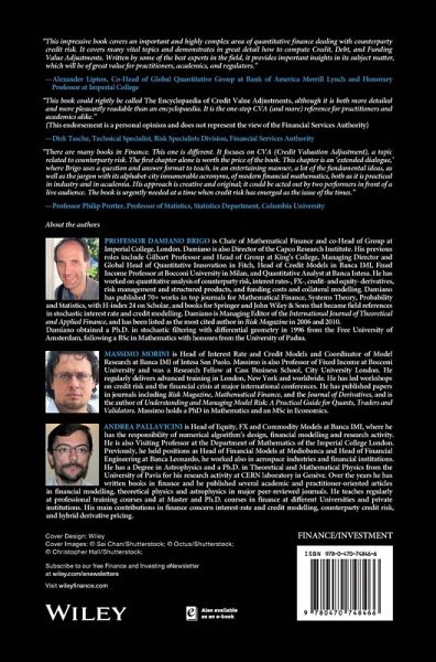 PROFESSOR DAMIANO BRIGO is Chair of Mathematical Finance and co-Head of Group at Imperial College, London. Damiano is also Director of the Capco Research Institute. His previous roles include Gilbart Professor and Head of Group at King's College, Managing Director and Global Head of Quantitative Innovation in Fitch, Head of Credit Models in Banca IMI, Fixed Income Professor at Bocconi University in Milan, and Quantitative Analyst at Banca Intesa. He has worked on quantitative analysis of counterparty risk, interest rates-, FX-, credit- and equity- derivatives, risk management and structured products, and funding costs and collateral modelling. Damiano has published 70+ works in top journals for Mathematical Finance, Systems Theory, Probability and Statistics, with H-index 24 on Scholar, and books for Springer and John Wiley & Sons that became field references in stochastic interest rate and credit modelling. Damiano is Managing Editor of the International Journal of Theoretical and Applied Finance, and has been listed as the most cited author in Risk Magazine in 2006 and 2010. Damiano obtained a Ph.D. in stochastic filtering with differential geometry in 1996 from the Free University of Amsterdam, following a BSc in Mathematics with honours from the University of Padua. MASSIMO MORINI is Head of Interest Rate and Credit Models and Coordinator of Model Research at Banca IMI of Intesa San Paolo. Massimo is also Professor of Fixed Income at Bocconi University and was a Research Fellow at Cass Business School, City University London. He regularly delivers advanced training in London, New York and worldwide. He has led workshops on credit risk and the financial crisis at major international conferences. He has published papers in journals including Risk Magazine, Mathematical Finance, and the Journal of Derivatives, and is the author of Understanding and Managing Model Risk: A Practical Guide for Quants, Traders and Validators. Massimo holds a PhD in Mathematics and an MSc in Economics. ANDREA PALLAVICINI is Head of Equity, FX and Commodity Models at Banca IMI, where he has the responsibility of numerical algorithm's design, financial modelling and research activity. He is also Visiting Professor at the Department of Mathematics of the Imperial College London. Previously, he held positions as Head of Financial Models at Mediobanca and Head of Financial Engineering at Banca Leonardo, he worked also in aerospace industries and financial institutions. He has a Degree in Astrophysics and a Ph.D. in Theoretical and Mathematical Physics from the University of Pavia for his research activity at CERN laboratory in Genève. Over the years he has written books in finance and he published several academic and practitioner-oriented articles in financial modelling, theoretical physics and astrophysics in major peer-reviewed journals. He teaches regularly at professional training courses and at Master and Ph.D. courses in finance at different Universities and private institutions. His main contributions in finance concern interest-rate and credit modelling, counterparty credit risk, and hybrid derivative pricing.