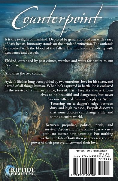 It is the twilight of mankind. Depleted by generations of war with a race of dark beasts, humanity stands on the brink of extinction. The outlands are soaked with the blood of the fallen. The midlands are rotting with decadence and despair. Elfkind, estranged by past crimes, watches and waits for nature to run its course. And then the two collide. Ayden’s life has long been guided by two emotions: love for his sister, and hatred of all things human. When he’s captured in battle, he is enslaved in the service of a human prince, Freyrik Farr. Freyrik’s always known elves to be beautiful and dangerous, but never has one affected him as deeply as Ayden. Teetering on a dagger’s edge between duty and high treason, Freyrik discovers that some choices can change a life, and some an entire world. Between prejudice, politics, pride, and survival, Ayden and Freyrik must carve a new path, no matter how daunting. For nothing less than the fate of both their peoples rests on the power of their perseverance—and their love.