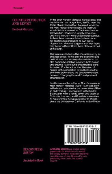 In this book Herbert Marcuse makes clear that capitalism is now reorganizing itself to meet the threat of a revolution that, if realized, would be the most radical of revolutions: the first truly world-historical revolution. Capitalism's counterrevolution, however, is largely preventive, and in the Western world altogether preventive. Yet capitalism is producing its own grave-diggers, and Marcuse suggests that their faces may be very different from those of the wretched of the earth. The future revolution will be characterized by its enlarged scope, for not only the economic and political structure, not only class relatoins, but also humanity's relation to nature (both human and external nature) tend toward radical transformation. For the author, the "liberation of nature" is the connecting thread between the economic-political and the cultural revolution, between "changing the world" and personal emancipation.
