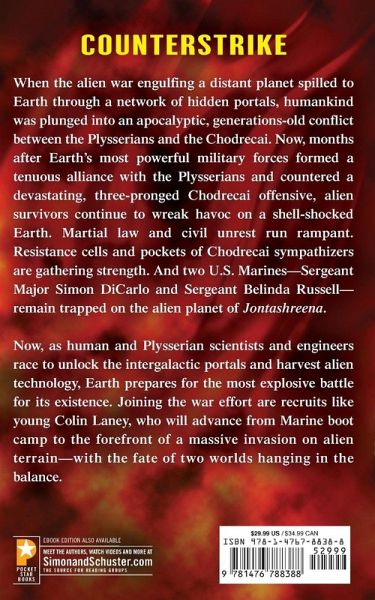 COUNTERSTRIKE When the alien war engulfing a distant planet spilled to Earth through a network of hidden portals, humankind was plunged into an apocalyptic, generations-old conflict between the Plysserians and the Chodrecai. Now, months after Earth’s most powerful military forces formed a tenuous alliance with the Plysserians and countered a devastating, three-pronged Chodrecai offensive, alien survivors continue to wreak havoc on a shell-shocked Earth. Martial law and civil unrest run rampant. Resistance cells and pockets of Chodrecai sympathizers are gathering strength. And two U.S. Marines—Sergeant Major Simon DiCarlo and Sergeant Belinda Russell— remain trapped on the alien planet of Jontashreena. Now, as human and Plysserian scientists and engineers race to unlock the intergalactic portals and harvest alien technology, Earth prepares for the most explosive battle for its existence. Joining the war effort are recruits like young Colin Laney, who will advance from Marine boot camp to the forefront of a massive invasion on alien terrain—with the fate of two worlds hanging in the balance.