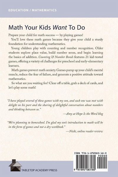 Prepare your child for math success-by playing games! You'll love these math games because they give your child a sturdy foundation for understanding mathematics. Young children play with counting and number recognition. Older students explore place value, build number sense, and begin learning the basics of addition. Counting & Number Bonds features 21 kid-tested games, offering a variety of challenges for preschool and early-elementary learners. Chapters include: Early Counting: Practice subitizing-recognizing small numbers of items at a glance-and learn the number symbols. Childhood Classics: Traditional folk games invite the whole family to enjoy playing with math. Number Bonds: Build a mental picture of the relationships between numbers as you begin to explore addition. Bigger Numbers: Develop familiarity with two-digit numbers and promote strategic thinking skills. Math games prevent math anxiety. Games pump up your child's mental muscle, reduce the fear of failure, and generate a positive attitude toward mathematics. Parents can use these games to enjoy quality time with your children. Classroom teachers like them as warm-ups and learning center activities or for a relaxing review day at the end of a term. If you are a tutor or homeschooler, make games a regular feature in your lesson plans to build your students' math skills. So what are you waiting for? Clear off a table, grab a deck of cards, and let's play some math!