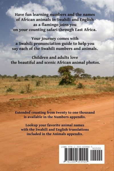 Have fun learning numbers and the names of African animals in Swahili and English as a flamingo joins you on your counting safari through East Africa. Your journey comes with a Swahili pronunciation guide to help you say each of the Swahili numbers and animals. Children and adults love the beautiful and scenic African animal photos. Extended counting from twenty to one thousand is available in the Numbers appendix. Lookup your favorite animal names with the Swahili and English translations included in the Animals appendix.