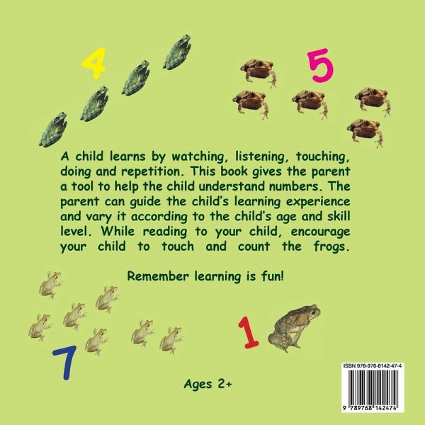Counting Belize Frogs and Toads presents number concepts using wildlife photographs of frogs and toads taken in Belize. Numbers will jump out for the children. The book is designed to help the parent/guardian/educator to teach young children about numbers in a fun and interactive method enjoyable to the child and the adult. Ages 2+