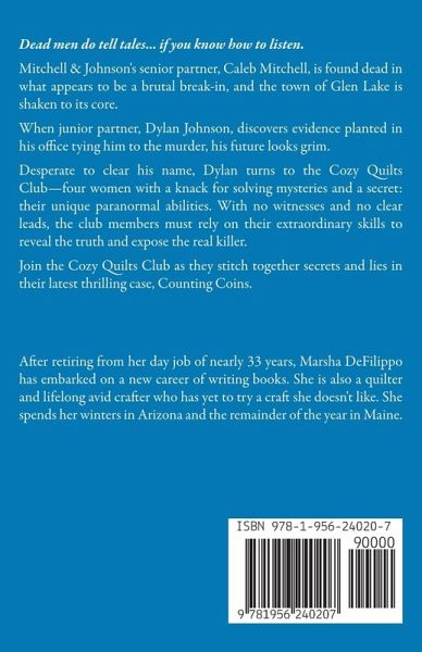 Dead men do tell tales... if you know how to listen. Mitchell & Johnson's senior partner, Caleb Mitchell, is found dead in what appears to be a brutal break-in, and the town of Glen Lake is shaken to its core. When junior partner, Dylan Johnson, discovers evidence planted in his office tying him to the murder, his future looks grim. Desperate to clear his name, Dylan turns to the Cozy Quilts Club-four women with a knack for solving mysteries and a secret: their unique paranormal abilities. With no witnesses and no clear leads, the club members must rely on their extraordinary skills to reveal the truth and expose the real killer. Join the Cozy Quilts Club as they stitch together secrets and lies in their latest thrilling case, Counting Coins.