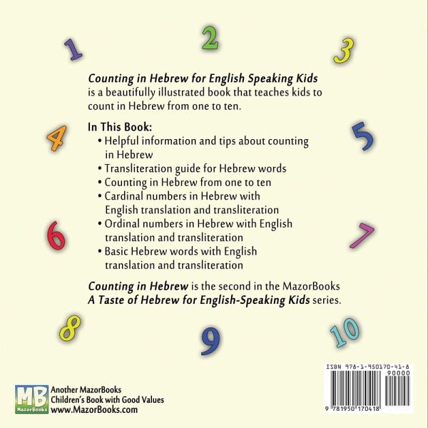 The Counting in Hebrew Picture Book for English Speaking Kids is a beautifully illustrated book that teaches kids to count in Hebrew from one to ten. The book includes the numbers written in Hebrew and in English as well as English transliteration of the numbers and all Hebrew words appearing in this volume. While enjoying this book, kids will have the opportunity to enhance their Hebrew vocabulary with words such as abba and imma (father and mother) and many others. The book also includes lists of Hebrew cardinal numbers from one to ten (1,2,3...) and Hebrew ordinal numbers from one to ten (1st, 2nd, 3rd...), as well as all the Hebrew words included in the pages in both their singular and plural versions. The Counting in Hebrew for English Speaking Kids is the second in the series of A Taste of Hebrew for English Speaking Kids Check out the other books in the series: 1. Hebrew Alphabet: Book of Rhymes for English Speaking Kids 2. Counting in Hebrew for English Speaking Kids 3. Colors in Hebrew: A Rainbow Tale 4. Animals in Hebrew: A Day in the Zoo 5. Fruits in Hebrew: At Old County Grove 6. Opposites in Hebrew for English Speaking Kids