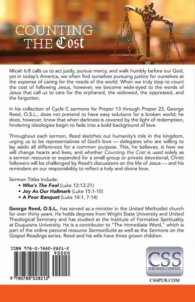 Micah 6:8 calls us to act justly, pursue mercy, and walk humbly before our God, yet in today's America, we often find ourselves pursuing justice for ourselves at the expense of caring for the needs of the world. When we truly stop to count the cost of following Jesus, however, we become wide-eyed to the words of Jesus that call us to care for the orphaned, the widowed, the oppressed, and the forgotten. In his collection of Cycle C sermons for Proper 13 through Proper 22, George Reed, O.S.L., does not pretend to have easy solutions for a broken world; he does, however, know that when darkness is covered by the light of redemption, hindering ideologies begin to fade into a bold background of love. Throughout each sermon, Reed sketches out humanity's role in the kingdom, urging us to be representatives of God's love -- delegates who are willing to lay aside all differences for a common purpose. This, he believes, is how we will change hearts and lives, and whether Counting the Cost is used solely as a sermon resource or expanded for a small group or private devotional, Christ followers will be challenged by Reed's discussions on the life of Jesus -- and his reminders on our responsibility to reflect a holy and divine love. Sermon Titles Include: • Who's The Fool (Luke 12:13-21) • Joy As Our Hallmark (Luke 15:1-10) • A Poor Banquet (Luke 14:1, 7-14) George Reed, O.S.L., has served as a minister in the United Methodist Church for over thirty years. He holds degrees from Wright State University and United Theological Seminary and has studied at the Institute of Formative Spirituality at Duquesne University. He is a contributor to "The Immediate Word," which is part of the online pastoral resource SermonSuite as well as the Sermons on the Gospel Readings series. Reed and his wife have three grown children.