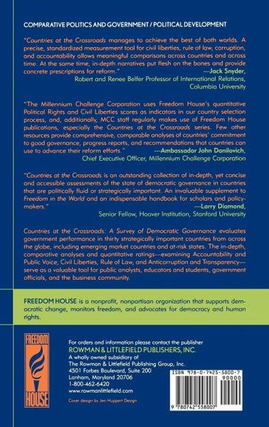 Countries at the Crossroads is an annual survey of government performance in 30 key countries worldwide that are at a critical crossroads in determining their political future. Crossroads provides a unique comparative tool for assessing government performance in the areas of accountability and public voice, civil liberties, rule of law, and anticorruption and transparency. The countries evaluated in Crossroads represent a range of governments: traditional or constitutional monarchies, one-party states or outright dictatorships, failed states, states where reforms have stalled or lagged behind,…mehr