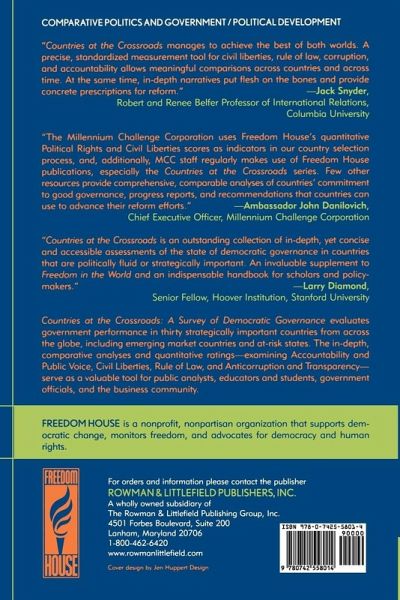 Countries at the Crossroads is an annual survey of government performance in 30 key countries worldwide that are at a critical crossroads in determining their political future. Crossroads provides a unique comparative tool for assessing government performance in the areas of accountability and public voice, civil liberties, rule of law, and anticorruption and transparency. The countries evaluated in Crossroads represent a range of governments: traditional or constitutional monarchies, one-party states or outright dictatorships, failed states, states where reforms have stalled or lagged behind, and states that suffer from insurgencies. The survey provides a comparative, in-depth assessment of democratic governance intended to help government officials, scholars, educators, nongovernmental organizations, and the media identify areas of progress and highlight points of concern. For the international community, the survey helps target diplomatic efforts and reform assistance. The narratives and scores clearly highlight the problems and successes of each government, and separate recommendations sections prioritize the steps that should be taken by the countries in question to remedy deficiencies in governance.