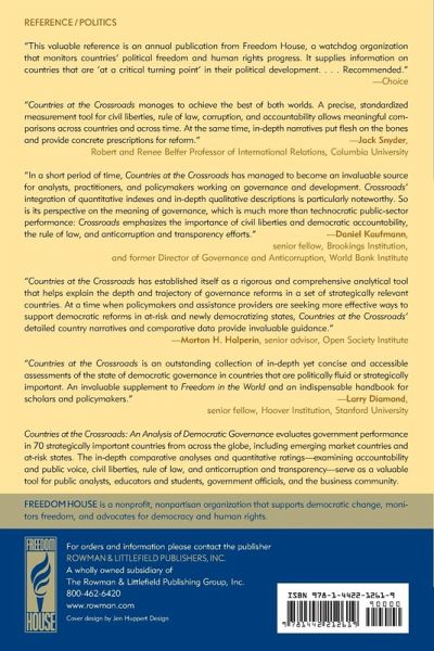 Countries at the Crossroads: An Analysis of Democratic Governance evaluates government performance in seventy strategically important countries from across the globe, including emerging market countries and at-risk states. The in-depth comparative analyses and quantitative ratings_examining Accountability and Public Voice, Civil Liberties, Rule of Law, and Anticorruption and Transparency_serve as a valuable tool for public analysts, educators and students, government officials, and the business community.