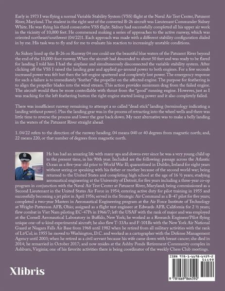 Early in 1973 I was flying a normal Variable Stability System (VSS) flight at the Naval Air Test Center, Patuxent River, Maryland. The student in the right seat of the converted B-26 aircraft was Lieutenant Commander Sidney White. He was flying his third consecutive VSS flight. Sidney had successfully completed all his upper air work in the vicinity of 10,000 feet. He commenced making a series of approaches to the active runway, which was oriented northeast/southwest (04/22)1. Each approach was made with a different stability configuration dialed in by me. His task was to fly and for me to evaluate his reaction to increasingly unstable conditions. As Sidney lined up the B-26 on Runway 04 one could see the beautiful blue waters of the Patuxent River beyond the end of the 10,000-foot runway. When the aircraft had descended to about 50 feet and was ready to be flared for landing I told him I had the airplane and simultaneously disconnected the variable stability system. After clicking off the VSS I raised the landing gear and applied go-around power to both engines. For a few seconds increased power was felt but then the left engine sputtered and completely lost power. The emergency response for such a failure is to immediately "feather" the propeller on the affected engine. The purpose for feathering is to align the propeller blades into the wind stream. This action provides minimum drag from the failed engine. The aircraft would then be more controllable with thrust from the "good" running engine. However, just as I was reaching for the left feathering button the right engine started losing power and it also completely failed. There was insufficient runway remaining to attempt a so called "dead stick" landing (terminology indicating a landing without power). Plus the landing gear was in the process of retracting into the wheel wells and there was little time to reverse the process and lower the gear back down. My next alternative was to make a belly landing in the waters of the Patuxent River straight ahead. 1. 04/22 refers to the direction of the runway heading. 04 means 040 or 40 degrees from magnetic north; and, 22 means 220, or that number of degrees from magnetic north.