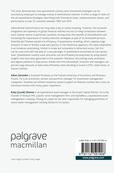 International diversification has long been a key to stable investing. However, the increased integration and openness of global financial markets has led to rising correlations between stock market returns in particular countries, driving down the benefits of diversification and increasing the importance of country selection strategies as part of an investment process. Zaremba and Shemer explain the efficiency of quantitative investing, which captures huge amounts of data of limited scope very quickly. In the traditional approach, this data compilation is an immense undertaking, limited in scope and vulnerable to behavioral errors, but this can be overcome with the help of a new paradigm of quantitative investment at the country level. Quantitative country asset allocation can be efficiently accomplished by using wealth insights that have been generated in the academic literature, discovering many anomalies and regular patterns in asset prices. Armed with this information, investors and managers can process large amounts of data more efficiently when deciding to invest in ETFs, index funds, or futures markets.