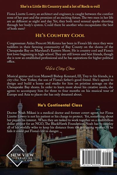 She's a little bit country and a lot of rock-n-roll. Fiona Lizette Lowry, an architect and engineer, is caught between the comfort zone of her past and the promises of an exciting future. The two men in her life are as different as night and day. Yet they both send sensual sparks shooting through her body's system. Could there be another who encapsulates the best of both men? He's County Cool US Congressman Aidan Prescott McKenna has been in Fiona's life since they were toddlers in their farming community of Bay County on the shores of the Chesapeake Bay on Maryland's Eastern Shore. He is pure country cool and Fiona's first lover beginning in high school. They are still lovers and best friends, though she is now an established architect and civil engineer and he has aspirations for higher political office. She has been on the campaign trail with him, but can he keep her by his side as he plans to become the president of the United States? He's City Chic Musical genius and icon Maxwell Bishop Kennard, III, Trey to his friends, is a city-chic New Yorker, the son of Fiona's father's good friend. Fiona has agreed to design and build a home and studio for him on pristine acreage on the Chesapeake Bay shores. In order to learn more about his creative needs, she agrees to accompany him on his musical tour of Europe and Asia to places she has only dreamed about. Fiona ito beenthralled with everything Trey has shown her about him and his life. However, can he create the music she is willing to hear for a lifetime together? He's Continental Class Doctor Noah Mikasi is a medical doctor, a former US Navy SEAL, and cover agent, with an abundance of continental class. However, Fiona Lizette Lowry is not his patient or his charge to serve and protect. Yet, something about her piques his interest and won't let him go. When they are tasked to work together on a multibillion-dollar project for an NGO, The BlackHawk Foundation, Noah has to employ all of his worldly wiles to keep his distance from the intriguing woman. If he fails, it could put Fiona's life in danger. If the time came, could he put his life on the line to save her?