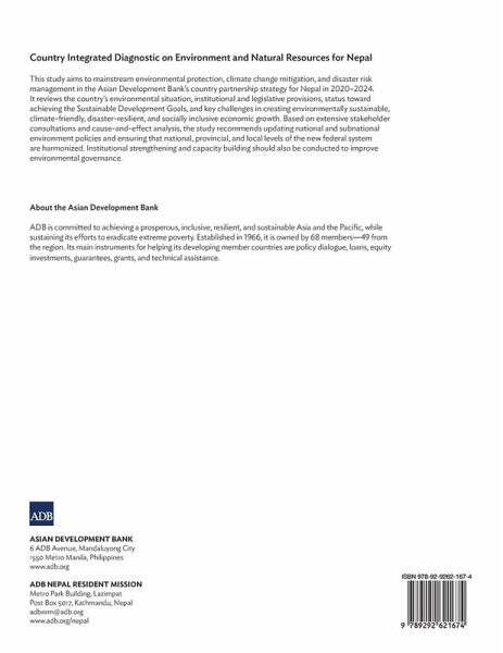 This study aims to mainstream environmental protection, climate change mitigation, and disaster risk management in the Asian Development Bank's country partnership strategy for Nepal in 2020-2024. It reviews the country's environmental situation, institutional and legislative provisions, status toward achieving the Sustainable Development Goals, and key challenges in creating environmentally sustainable, climate-friendly, disaster-resilient, and socially inclusive economic growth. Based on extensive stakeholder consultations and cause-and-effect analysis, the study recommends updating national and subnational environment policies and ensuring that national, provincial, and local levels of the new federal system are harmonized. Institutional strengthening and capacity building should also be conducted to improve environmental governance.