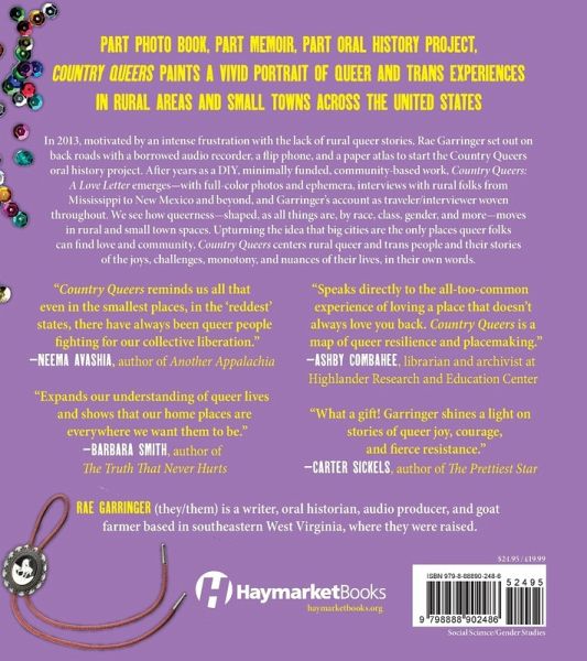 Part photo book, part memoir, part oral history project, this volume paints a vivid portrait of queer and trans experiences in rural areas and small towns across the US. In 2013, Rae Garringer embarked on the Country Queers oral history project with a borrowed audio recorder, a flip phone, and a paper atlas in a Subaru Forester with over 160,000 miles on it. Raised on a sheep farm in southeastern West Virginia, they were motivated by an intense frustration with the lack of rural queer stories and the isolation that comes with that absence. "Queers, in all our forms, have always existed," Garringer writes, "all across this continent since before it was colonized." After years as a DIY, minimally funded, community-based oral history project, the work now takes a new form in Country Queers: A Love Story-a book of full-color photos and interviews with rural folks from Mississippi to New Mexico and beyond, with Garringer's account as traveler and interviewer woven through the pages. In these intimate conversations, we see how queerness-shaped, as all things are, by race, class, gender, and more-moves in rural and small-town spaces, spotlighting how country queers make sense of their lives through reflections on land, home, community, and belonging. While media-driven myths suggest that big cities are the only places queer folks can find love and community, Country Queers resists that trope by centering rural queer and trans stories of the joys, challenges, monotony, and nuances of their lives, in their own words.
