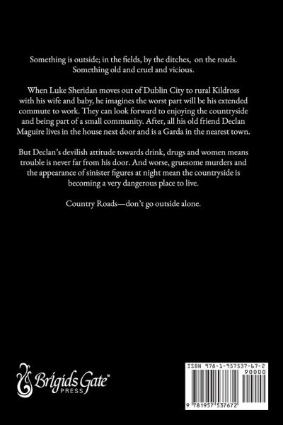 Something is outside; in the fields, by the ditches, on the roads. Something old and cruel and vicious. When Luke Sheridan moves out of Dublin city to rural Kilcross with his wife and baby, he imagines the worst part will be his extended commute to work. They can look forward to enjoying the countryside and being part of a small community. After all, his old friend Declan Maguire lives in the house next door and is a Garda in the nearest town. But Declan's devilish attitude towards drink, drugs and women means trouble is never far from his door. And worse, gruesome murders and the appearance of sinister figures at night mean the countryside is becoming a very dangerous place to live. Country Roads-don't go outside alone.