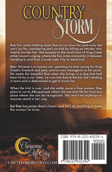 A cowboy veterinarian thought calming injured livestock would prepare him for anything in life, then he fell for a woman facing murder charges. Rae Fox wants nothing more than to put distance between her and the past-but a judge will only allow an instate move to the small town of King Creek. With her cousin's help, she maintains some anonymity in between traveling to and from court, where she stands trial for killing an intruder who tried to murder her. Country vet Bear McLeod spends his time caring for King Creek's livestock and pets, plus the menagerie on his ranch. When Rae brings in a dog that was hit by a car, he notices her kind heart and beauty. Later, he finds her tending bar in town and tries to get to know her, but she makes it difficult time and time again. That doesn't stop him. In this cowboy romance, Bear knows what fear looks like and can see it in Rae's eyes. She will run the first chance she gets, and love may not be strong enough to hold her back.