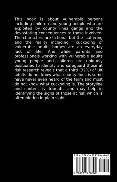 This book is about vulnerable persons including children and young people who are exploited by county lines gangs and the devastating consequences to those involved. The characters are fictional but the suffering and the reality including cuckooing of vulnerable adults homes are an everyday fact of life. And while parents and professionals working with vulnerable adults young people and children are uniquely positioned to identify and safeguard those at risk research reveals that a third (32%) of UK adults do not know what county lines is some have never even heard of the term and most do not know what cuckooing is. The storyline and content is dramatic and may help in identifying the signs of those at risk which is often hidden in plain sight.