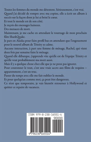 Toutes les femmes du monde me détestent. Sérieusement, c'est vrai. Quand j'ai décidé de rompre avec ma copine, elle a écrit un album à succès sur la façon dont je lui ai brisé le cur. Et tout le monde est de son côté. Je reçois des messages haineux. Des menaces de mort. Maintenant, je me cache en attendant le tournage de mon prochain film SharkQuake. Je pars en Alaska pour faire profil bas en attendant que l'engouement pour le nouvel album de Trinity se calme. Aucune interaction, à part une femme de ménage, Rachel, qui vient deux fois par semaine faire le ménage. Quand elle débarque, j'apprends vite qu'elle est de l'équipe Trinity et qu'elle veut probablement ma mort aussi. Mais il y a quelque chose chez elle que je ne peux pas ignorer. Pour couronner le tout, c'est une vraie accro aux films de requins - apparemment, c'est un truc. Passer du temps avec elle me fait oublier le monde. Et pour quelqu'un comme moi, ça peut être dangereux. Ce n'est que temporaire, je vais bientôt retourner à Hollywood et quitter ce repaire de vacances.