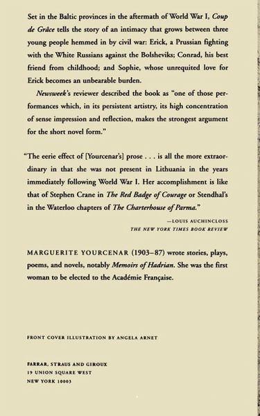 Set in the Baltic provinces in the aftermath of World War I, Coup de Grace tells the story of an intimacy that grows between three young people hemmed in by civil war: Erick, a Prussian fighting with the White Russians against the Bolsheviks; Conrad, his best friend from childhood; and Sophie, whose unrequited love for Conrad becomes an unbearable burden.