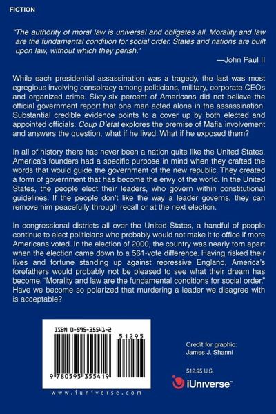 'The authority of moral law is universal and obligates all. Morality and law are the fundamental condition for social order. States and nations are built upon law, without which they perish." -John Paul II While each presidential assassination was a tragedy, the last was most egregious involving conspiracy among politicians, military, corporate CEOs and organized crime. Sixty-six percent of Americans did not believe the official government report that one man acted alone in the assassination. Substantial credible evidence points to a cover up by both elected and appointed officials. Coup D'etat explores the premise of Mafia involvement and answers the question, what if he lived. What if he exposed them? In all of history there has never been a nation quite like the United States. America's founders had a specific purpose in mind when they crafted the words that would guide the government of the new republic. They created a form of government that has become the envy of the world. In the United States, the people elect their leaders, who govern within constitutional guidelines. If the people don't like the way a leader governs, they can remove him peacefully through recall or at the next election. In congressional districts all over the United States, a handful of people continue to elect politicians who probably would not make it to office if more Americans voted. In the election of 2000, the country was nearly torn apart when the election came down to a 561-vote difference. Having risked their lives and fortune standing up against repressive England, America's forefathers would probably not be pleased to see what their dream has become. 'Morality and law are the fundamental conditions for social order." Have we become so polarized that murdering a leader we disagree with is acceptable?