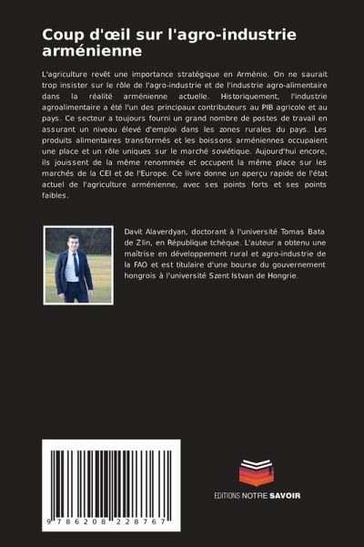 L'agriculture revêt une importance stratégique en Arménie. On ne saurait trop insister sur le rôle de l'agro-industrie et de l'industrie agro-alimentaire dans la réalité arménienne actuelle. Historiquement, l'industrie agroalimentaire a été l'un des principaux contributeurs au PIB agricole et au pays. Ce secteur a toujours fourni un grand nombre de postes de travail en assurant un niveau élevé d'emploi dans les zones rurales du pays. Les produits alimentaires transformés et les boissons arméniennes occupaient une place et un rôle uniques sur le marché soviétique. Aujourd'hui encore, ils jouissent de la même renommée et occupent la même place sur les marchés de la CEI et de l'Europe. Ce livre donne un aperçu rapide de l'état actuel de l'agriculture arménienne, avec ses points forts et ses points faibles.