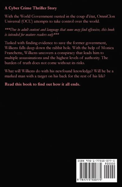 A Cyber Crime Thriller Story With the World Government ousted in the coup d'état, OmniClon Universal (OCU) attempts to take control over the world. ***Due to adult content and language that some may find offensive, this book is intended for mature readers only*** Tasked with finding evidence to save the former government, Wilkens falls deep down the rabbit hole. With the help of Monica Franchette, Wilkens uncovers a conspiracy that leads him to multiple assassinations and the highest levels of authority. The burden of truth does not come without its risks. What will Wilkens do with his newfound knowledge? Will he be a marked man with a target on his back for the rest of his life? Read this book to find out what happens.