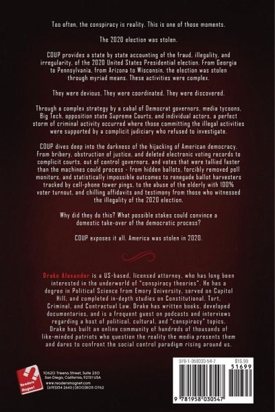 Too often, the conspiracy is reality. This is one of those moments. The 2020 election was stolen. COUP provides a state by state accounting of the fraud, illegality, and irregularity, of the 2020 United States Presidential election. From Georgia to Pennsylvania, from Arizona to Wisconsin, the election was stolen through myriad means. These activities were complex. They were devious. They were coordinated. They were discovered. Through a complex strategy by a cabal of Democrat governors, media tycoons, Big Tech, opposition state Supreme Courts, and individual actors, a perfect storm of criminal activity occurred where those committing the illegal activities were supported by a complicit judiciary who refused to investigate. COUP dives deep into the darkness of the hijacking of American democracy. From bribery, obstruction of justice, and deleted electronic voting records to complicit courts, out of control governors, and votes that were tallied faster than the machines could process - from hidden ballots, forcibly removed poll monitors, and statistically impossible outcomes to renegade ballot harvesters tracked by cell-phone tower pings, to the abuse of the elderly with 100% voter turnout, and chilling affidavits and testimony from those who witnessed the illegality of the 2020 election. Why did they do this? What possible stakes could convince a domestic take-over of the democratic process? COUP exposes it all. America was stolen in 2020.