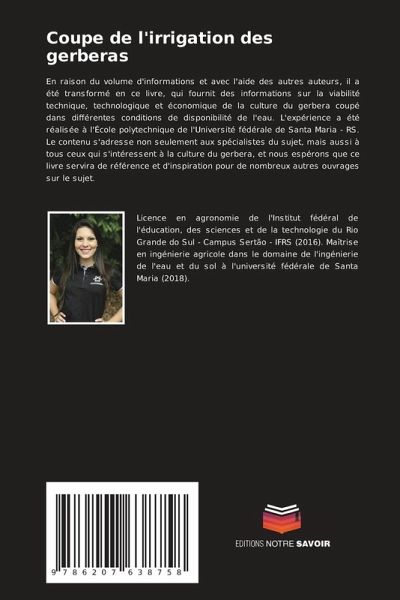 En raison du volume d'informations et avec l'aide des autres auteurs, il a été transformé en ce livre, qui fournit des informations sur la viabilité technique, technologique et économique de la culture du gerbera coupé dans différentes conditions de disponibilité de l'eau. L'expérience a été réalisée à l'École polytechnique de l'Université fédérale de Santa Maria - RS. Le contenu s'adresse non seulement aux spécialistes du sujet, mais aussi à tous ceux qui s'intéressent à la culture du gerbera, et nous espérons que ce livre servira de référence et d'inspiration pour de nombreux autres ouvrages sur le sujet.