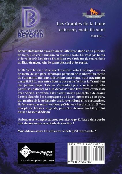 Les Couples de la Lune existent, mais ils sont rares… Adrian Rothschild n'ayant jamais atteint le stade de sa puberté de loup, il se croit humain, en quelque sorte. Ce n'est pas le cas et le voilà prêt à subir sa Transition avec huit ans de retard dans un État étranger, loin de sa meute, seul et terrorisé. Le Dr Tate Lewis a vécu une Transition catastrophique sous la houlette de son père, fanatique partisan de la libération totale de l'animalité du loup. Désormais autonome, Tate travaille au camp H.U.R.L., un centre dont le but est de faciliter la Transition des jeunes loups. Tate ne s'attendait pas à avoir un adulte parmi ses patients ni à se découvrir une très forte connexion avec Adrian. En vérité, Tate n'était même pas certain de croire à cette légende des Compagnons de Lune. Après tout, son père, qui pratiquait la polygamie, avait revendiqué cinq partenaires. Il n'en reste pas moins évident qu'Adrian a besoin de lui. Si Tate accepte de baisser sa garde, peut-être découvrira-t-il que lui aussi a besoin d'Adrian. Un loup n'est complet qu'avec son alter-ego. Et Tate a déjà perdu tant de morceaux essentiels de son être ! Mais Adrian saura-t-il affronter le défi qu'il représente ?