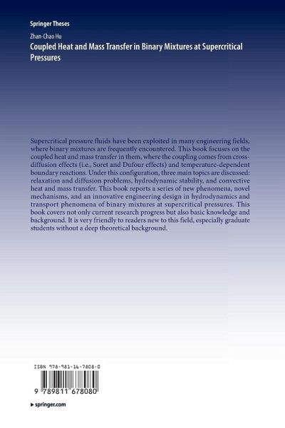 Supercritical pressure fluids have been exploited in many engineering fields, where binary mixtures are frequently encountered. This book focuses on the coupled heat and mass transfer in them, where the coupling comes from cross-diffusion effects (i.e., Soret and Dufour effects) and temperature-dependent boundary reactions. Under this configuration, three main topics are discussed: relaxation and diffusion problems, hydrodynamic stability, and convective heat and mass transfer. This book reports a series of new phenomena, novel mechanisms, and an innovative engineering design in hydrodynamics and transport phenomena of binary mixtures at supercritical pressures. This book covers not only current research progress but also basic knowledge and background. It is very friendly to readers new to this field, especially graduate students without a deep theoretical background.