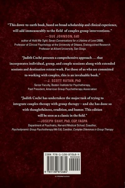 Rutan, Foreword. Introduction. Part I: Structuring Couples Group Psychotherapy. Preparing Couples for Couples Group Psychotherapy. Structuring an Efficient Treatment Package. Establishing and Maintaining Workable Group Policies. Part II: Psychotherapy with Couples in Groups. Treatment Skills with Intimate Partners. Building Cohesiveness in Couples and Groups. Making the Most of the Stages of Group Development. Designing Effective Structured Interventions. Part III: Integrating Theory, Research, and Treatment for Couples in Groups. The Intervention Hierarchy: Four Levels. Handling Predictable Problems in Ongoing Groups. Coordinating Clinical Diagnosis with Outcome Research. Recent Advances in Couples Expertise: Theory, Research, and Practice. Appendices. Appendix A. Group Therapy Forms and Policies. Appendix B. Structured Exercises for Members. Appendix C: Educating Couples about Communication. Appendix D: A Who's Who of Our Couples.