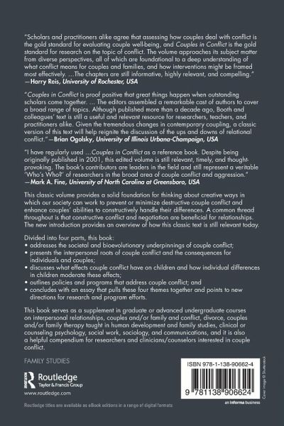 This classic volume provides a solid foundation for thinking about creative ways in which our society can work to prevent or minimize destructive couple conflict and enhance couples' abilities to constructively handle their differences. A common thread throughout is that constructive conflict and negotiation are beneficial for relationships. The new introduction provides an overview of how this classic text is still relevant today. Divided into four parts, this book: *addresses the societal and bio-evolutionary underpinnings of couple conflict; *presents the interpersonal roots of couple conflict and the consequences for individuals and couples; *discusses what effects couple conflict have on children and how individual differences in children moderate these effects; *outlines policies and programs that address couple conflict; and * concludes with an essay that pulls these four themes together and points to new directions for research and program efforts. This book serves as a supplement in graduate or advanced undergraduate courses on interpersonal relationships, couples and/or family and conflict, divorce, couples and/or family therapy taught in human development and family studies, clinical or counseling psychology, social work, sociology, and communications and it is also a helpful compendium for researchers and clinicians/counselors interested in couple conflict.