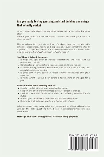 You love each other. But do you actually know how to build a life together? What if the person you're marrying avoids hard conversations? What if you do? What happens when plans fall through, or values don't match as well as you thought they did? These questions don't mean something is wrong-they mean you're taking this seriously. This workbook is for couples who want more than just a beautiful wedding. It's for couples who want to stop guessing and start preparing. Because marriage isn't built on feelings alone. It's built on what you say when you're frustrated. How you handle silence. What you do when your partner needs support, but you're running on empty. Too many couples assume love will carry them through. Until the first fight about money. Until family drama starts interfering. Until one of you wants kids and the other isn't sure anymore. That's when "we're just different" turns into "we don't know how to talk anymore." This book is where you work through the real stuff before it works against you. You'll love this book because: * It walks you through conversations about money, sex, roles, expectations, and values without pressure or awkward buildup * It gives you reflection questions that lead to honest, eye-opening conversations-without turning every talk into a debate * It shows you how to stay connected when life gets chaotic, not just when things are calm * It includes prompts and phrases for when you're stuck or emotionally charged * It helps you build a real partnership based on communication, not assumptions Save countless hours learning how to: * Talk about what matters-without shutting down, blowing up, or avoiding it altogether * Handle conflict without turning it into a scorecard * Support each other during stress, change, and uncertainty * Keep your connection strong over time, especially when routines start pulling you apart * Build a shared life that fits both of you, not just one of you You don't have to figure everything out before the wedding, but you do need to be honest about where you stand and where you're willing to grow. Whether you've been dating for a few months or a few years, this workbook gives you a way to slow down and take your relationship seriously-without feeling like you're walking into therapy. If you're ready to stop hoping it all works out and start knowing what you're building-this is your starting point.