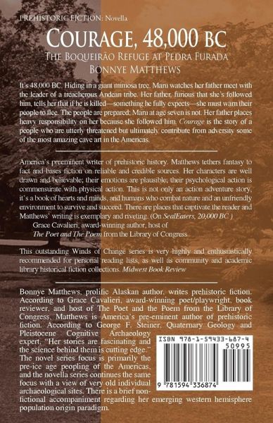 It's 48,000 BC. Hiding in a giant mimosa tree, Maru watches her father meet with the leader of a treacherous Andean tribe. Her father, furious that she's followed him, tells her that if he is killed--something he fully expects--she must warn their people to flee. The people are prepared; Maru at age seven is not. Her father places heavy responsibility on her because she followed him. "Courage is the story of a people who are utterly threatened but ultimately contribute from adversity some of the most amazing cave art in the Americas. America's preeminent writer of prehistoric history. Matthews tethers fantasy to fact and bases fi ction on reliable and credible sources. Her characters are well drawn and believable; their emotions are plausible; their psychological action is commensurate with physical action. This is not only an action adventure story, it's a book of hearts and minds, and humans who combat nature and an unfriendly environment to survive and succeed. There are places that captivate the reader and Matthews' writing is exemplary and riveting." (On SealEaters, 20,000 BC ) Grace Cavalieri, award-winning author, host of The Poet and The Poem from the Library of Congress "This outstanding Winds of Change series is very highly and enthusiastically recommended for personal reading lists, as well as community and academic library historical fiction collections." Midwest Book Review
