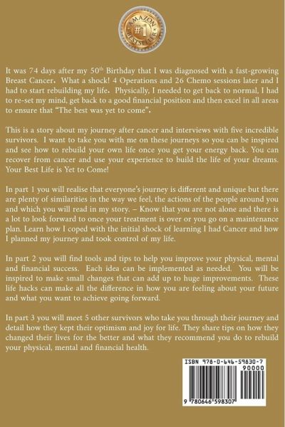 It was 74 days after my 50th Birthday that I was diagnosed with a fast-growing Breast Cancer. What a shock! 4 Operations and 26 Chemo sessions later and I had to start rebuilding my life. Physically, I needed to get back to normal, I had to re-set my mind, get back to a good financial position and then excel in all areas to ensure that "The best was yet to come". This is a story about my journey after cancer and interviews with five incredible survivors. I want to take you with me on these journeys so you can be inspired and see how to rebuild your own life once you get your energy back. You can recover from cancer and use your experience to build the life of your dreams. Your Best Life is Yet to Come! In Part 1 you will realise that everyone’s journey is different and unique but there are plenty of similarities in the way we feel and the actions of the people around you. Know that you are not alone and there is a lot to look forward to once your treatment is over or you go on a maintenance plan. Learn how I coped with the initial shock of learning I had Cancer and how I planned my journey and took control of my life. In Part 2 you will find tools and tips to help you improve your physical, mental and financial success. Each idea can be implemented as needed. You will be inspired to make small changes that can add up to huge improvements. These life hacks can make all the difference in how you are feeling about your future and what you want to achieve going forward. Each of these ideas can help you form new habits, regain your mental strength, and prove that you can take control of the important things around you. Your fate will not be left hanging because you can be a proactive participant in your future and make it exciting and fulfilling. In Part 3 you will meet 5 other Survivors who take you through their own journeys and detail how they kept their optimism and joy for life. They share tips on how they changed their lives for the better and what they recommend you do to rebuild your physical, mental and financial health. They will inspire you with their stories and give you ideas on how you too, can make this world a better place and find the gifts in your illness.