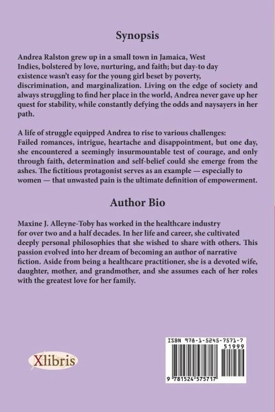 Andrea Ralston grew up in a small town in Jamaica, West Indies, bolstered by love, nurturing, and faith; but day-to-day existence wasn't easy for the young girl beset by poverty, discrimination, and marginalization. Living on the edge of society and always struggling to find her place in the world, Andrea never gave up her quest for stability while constantly defying the odds and naysayers in her path. A life of struggle equipped Andrea to rise to various challenges: failed romances, intrigue, heartache, and disappointment. But one day, she encountered a seemingly insurmountable test of courage, and only through faith, determination, and self-belief could she emerge from the ashes. The fictitious protagonist serves as an example--especially to women--that unwasted pain is the ultimate definition of empowerment.