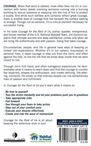 Courage. When that word is uttered, more often than not it’s in connection with heroic deeds involving someone running into a burning building to rescue someone or stepping into the line of fire to protect a buddy. And while such selfless acts certainly reflect great courage, there is another level of courage that lies beneath the surface waiting to emerge. Though not as extreme, it’s a critical element necessary for successful living. In his book Courage for the Rest of Us, author, speaker, entrepreneur, and former member of the U.S. National Bobsled Team, Jim Eschrich explains that ultimate success and deep satisfaction comes only when we are living life authentically and with passion. Doing that takes courage. Circumstances, people, and life in general have ways of keeping us locked into expectations. Whether it’s in our careers, businesses, or personal lives, it takes courage to step out from the norm, and often against the tide, to live the life that we know deep inside that we were meant to live. Through Jim’s first hand, and often outrageous experiences, he demonstrates what it means to reach down and find the courage to counter the expected, release the enthusiasm, and create defining, life-altering, moments. He shows us that ordinary people can live extraordinary lives of passion and fulfillment. In Courage for the Rest of Us you’ll learn what it means to: • Be true to yourself • Toss the victim mentality and let your problems push you to greatness • Take appropriate risks • Fail forward • See through your fears to take action • Step out of your comfort zone • Execute your dreams effectively • Create and ride the wave of momentum Courage for the Rest of Us is all about keeping the adventure alive in you!