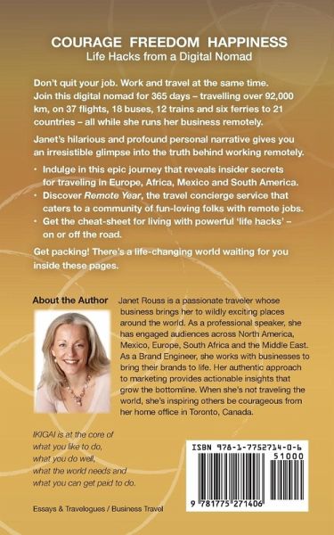 Don’t quit your job. Work and travel at the same time. Join this digital nomad for 365 days – traveling over 92,000 km, on 37 flights, 18 buses, 12 trains and six ferries to 21 countries – all while she runs her business remotely. Janet’s hilarious and profound personal narrative gives you an irresistible glimpse into the truth behind working remotely. Indulge in this epic journey that reveals insider secrets for traveling in Europe, Africa, Mexico and South America. Discover Remote Year, the travel concierge service that caters to a community of fun-loving folks with remote jobs. Get the cheat-sheet for living with powerful ‘life hacks’ – on or off the road. Get packing! There’s a life-changing world waiting for you inside these pages. ORDER Courage Freedom Happiness – Life Hacks from a Digital Nomad TODAY!