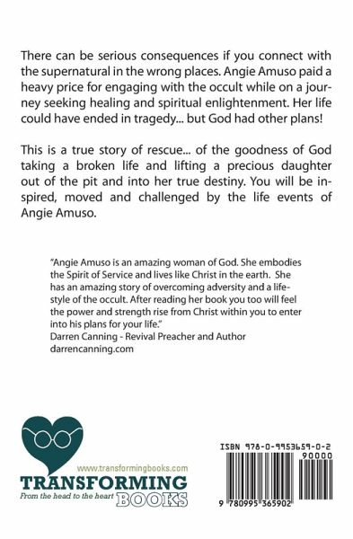 There can be serious consequences if you connect with the supernatural in the wrong places. Angie Amuso paid a heavy price for engaging with the occult while on a journey seeking healing and spiritual enlightenment. Her life could have ended in tragedy... but God had other plans! This is a true story of rescue... of the goodness of God taking a broken life and lifting a precious daughter out of the pit and into her true destiny. You will be inspired, moved and challenged by the life events of Angie Amuso.