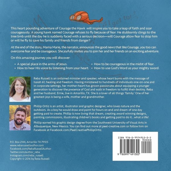 This heart pounding adventure of Courage the Hawk will inspire you to take a leap of faith and soar courageously. A young hawk named Courage refuses to fly because of fear. He stubbornly clings to the tree limb until the day he is suddenly faced with a serious decision-will Courage allow fear to stop him or will he fly to save his family and friends from danger? At the end of the story, Mama Marie, the narrator, announces the good news that like Courage, you too can overcome fear and be courageous. She joyfully invites you to join her and her friends on an exciting adventure. On this amazing journey you will discover: • A special place in the arms of Jesus. • How to be courageous in the midst of fear. • How to hear His voice by listening from your heart. • How to use God's Word as your mighty sword.