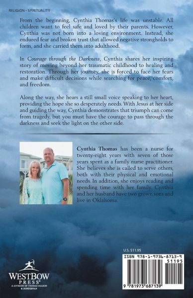 From the beginning, Cynthia Thomas's life was unstable. All children want to feel safe and loved by their parents. However, Cynthia was not born into a loving environment. Instead, she endured fear and broken trust that allowed negative strongholds to form, and she carried them into adulthood. In Courage through the Darkness, Cynthia shares her inspiring story of moving beyond her traumatic childhood to healing and restoration. Through her journey, she is forced to face her fears and make difficult decisions while searching for peace, comfort, and freedom. Along the way, she hears a still small voice speaking to her heart, providing the hope she so desperately needs. With Jesus at her side and guiding the way, Cynthia demonstrates that triumph can come from tragedy, but you must have the courage to pass through the darkness and seek the light on the other side.