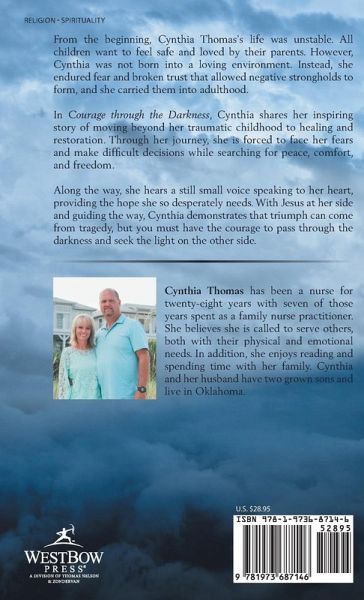 From the beginning, Cynthia Thomas's life was unstable. All children want to feel safe and loved by their parents. However, Cynthia was not born into a loving environment. Instead, she endured fear and broken trust that allowed negative strongholds to form, and she carried them into adulthood. In Courage through the Darkness, Cynthia shares her inspiring story of moving beyond her traumatic childhood to healing and restoration. Through her journey, she is forced to face her fears and make difficult decisions while searching for peace, comfort, and freedom. Along the way, she hears a still small voice speaking to her heart, providing the hope she so desperately needs. With Jesus at her side and guiding the way, Cynthia demonstrates that triumph can come from tragedy, but you must have the courage to pass through the darkness and seek the light on the other side.