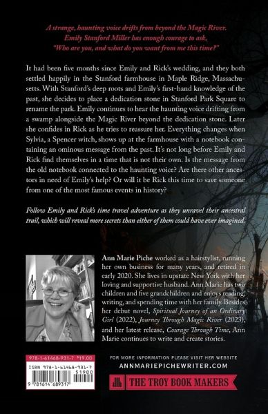 A strange, haunting voice drifts from beyond the Magic River. Emily Stanford Miller has enough courage to ask, "Who are you, and what do you want from me this time?" It had been five months since Emily and Rick's wedding, and they both settled happily in the Stanford farmhouse in Maple Ridge, Massachusetts. With Stanford's deep roots and Emily's first-hand knowledge of the past, she decides to place a dedication stone in Stanford Park Square to rename the park. Emily continues to hear the haunting voice drifting from a swamp alongside the Magic River beyond the dedication stone. Later she confides in Rick as he tries to reassure her. Everything changes when Sylvia, a Spencer witch, shows up at the farmhouse with a notebook containing an ominous message from the past. It's not long before Emily and Rick find themselves in a time that is not their own. Is the message from the old notebook connected to the haunting voice? Are there other ancestors in need of Emily's help? Or will it be Rick this time to save someone from one of the most famous events in history? Follow Emily and Rick's time travel adventure as they unravel their ancestral trail, which will reveal more secrets than either of them could have ever imagined.